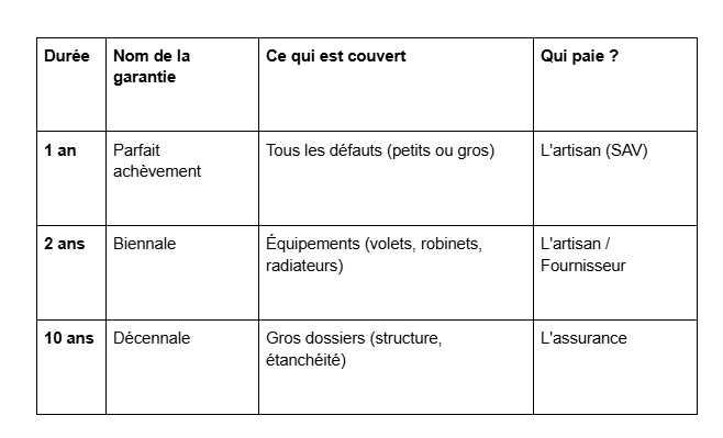 Lorsqu'un chantier est livré, on souhaiterait que tout soit définitivement terminé. Pourtant, c'est souvent à ce moment précis que débute une période parfois incertaine : celle des garanties. Entre les petits ajustements de la première année et les problèmes plus sérieux qui peuvent survenir bien plus tard, il n'est pas toujours simple de déterminer qui doit prendre en charge quoi. De notre côté, nous sommes convaincus qu'un artisan bien informé est un artisan mieux protégé. Pour vous éviter de sortir des sommes astronomiques inutilement, ou au contraire, de laisser un désaccord s'envenimer, nous avons détaillé pour vous les trois garanties essentielles à la vie de vos ouvrages.